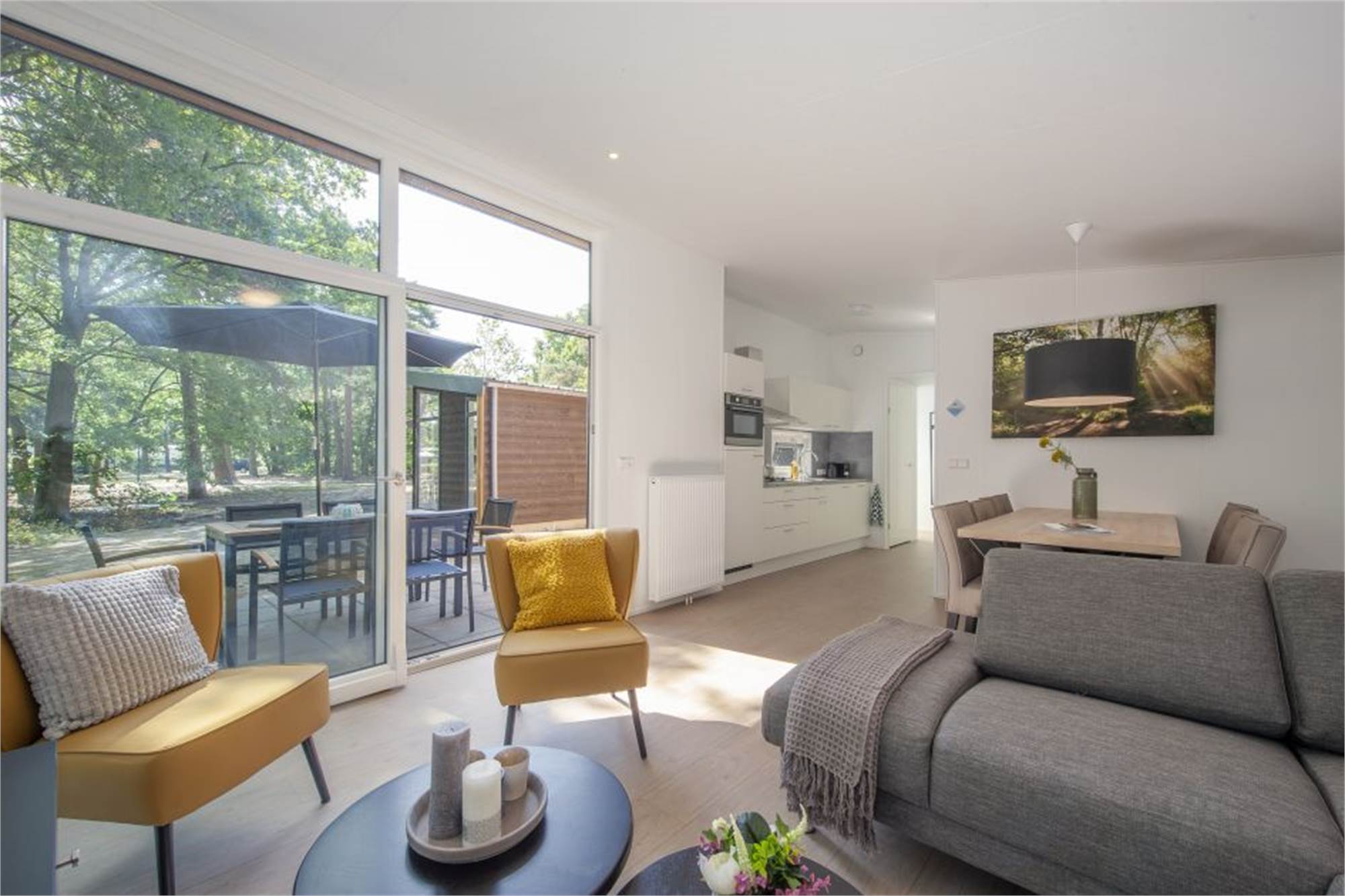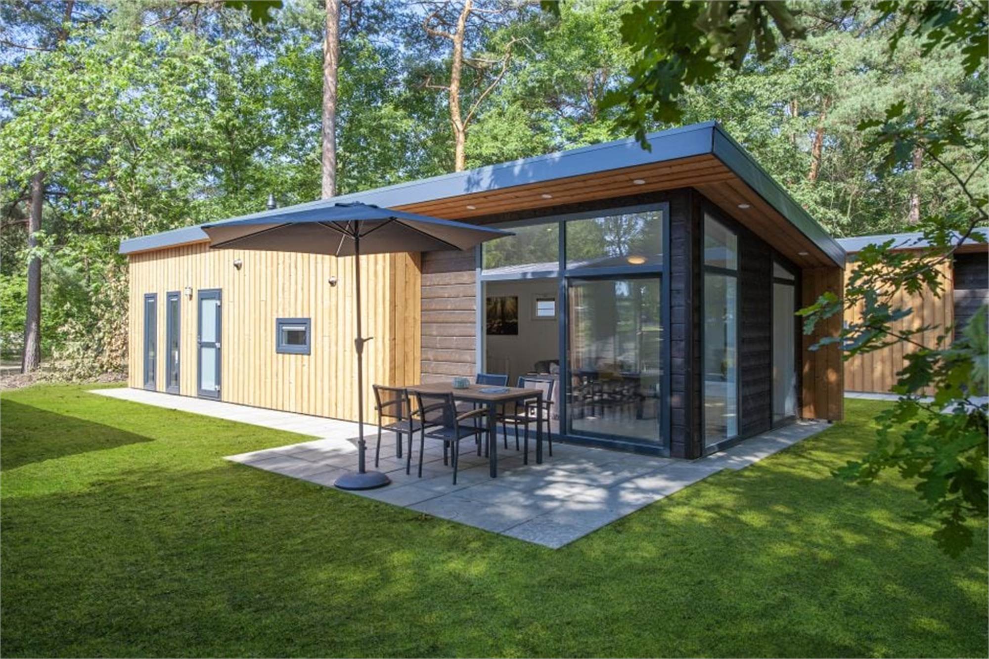 This is a brand new lodge type! A new lodge will of course include a new garden. The garden is not yet fully grown. If you would still like lounging on the lawn, or playing among the trees, there is plenty of space at the swimming pond!