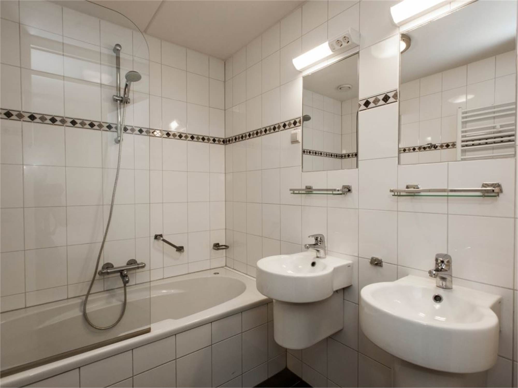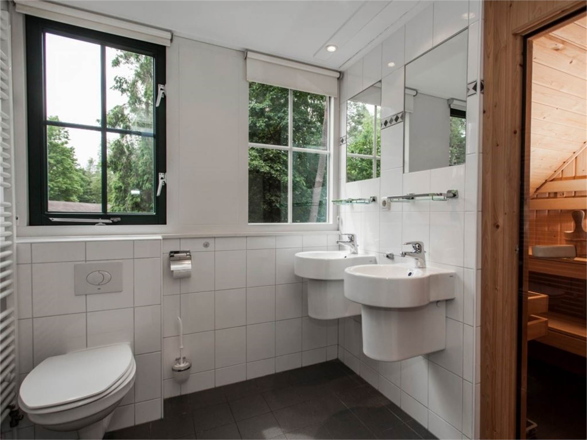 Bathroom with shower cubicle, double washbasin and toilet on the first floor