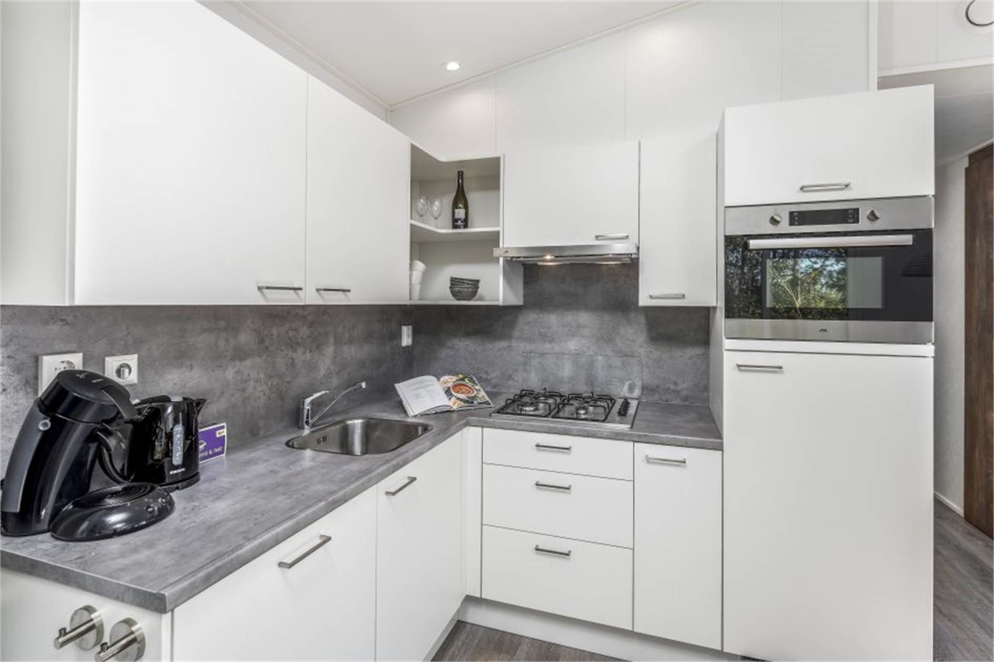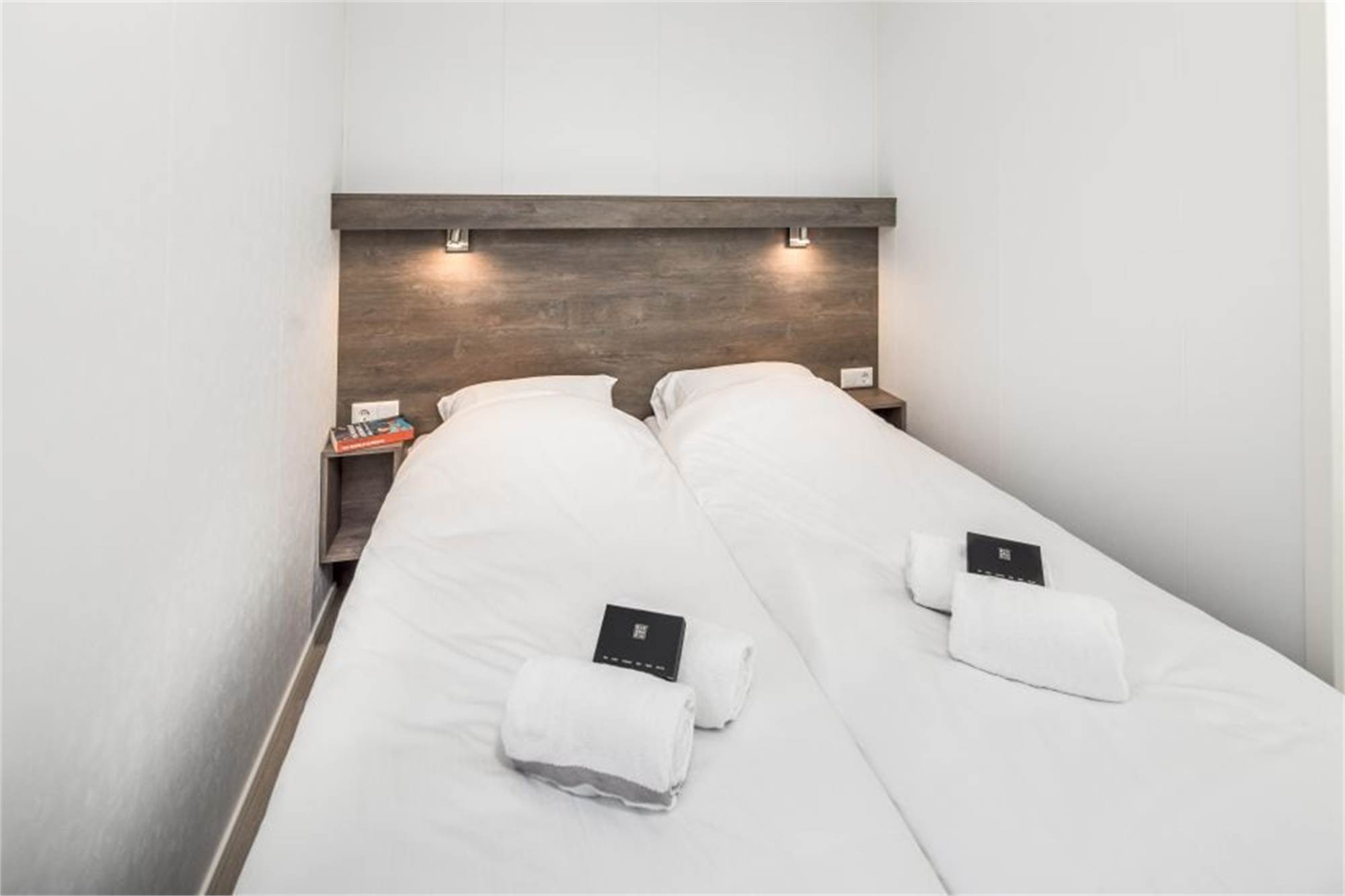 Detached, single-storey lodge for 4 adults and 2 children. The living room is stylishly furnished with modern decor and has a digital TV. The kitchen has a dishwasher, microwave, fridge with freezer and coffee pad machine. In addition, the lodge has three bedrooms, one of which has a bunk bed and a bathroom with shower (cabin) and toilet. The lodge is also equipped with garden furniture and offers free Wi-Fi. If you bring a cot, then take into account that there is no space for this in the bedroom. You can place the cot in the living room.