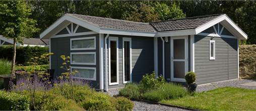 The chalet has a living room with a sitting area and a dining area. The kitchen features a combination microwave, coffee pad machine and a dishwasher. The bathroom is equipped with a shower cabin, toilet and a sink. There are 2 bedrooms, both with two sinlge beds. The chalet is surrounded by a terrace with garden furniture.