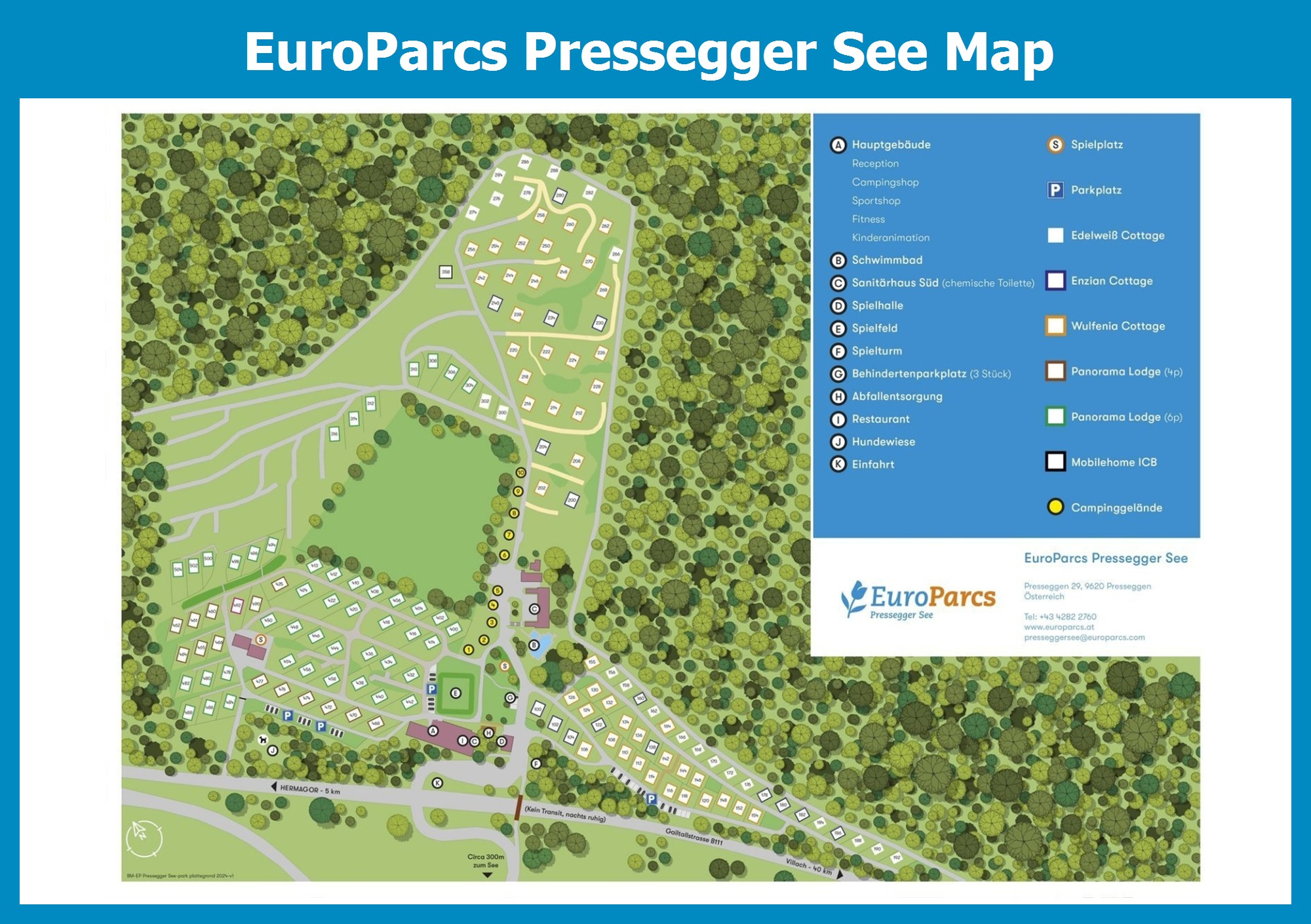 Up-to-date and comprehensive village map of EuroParcs Pressegger See with all accommodations and facilities, also available as PDF.