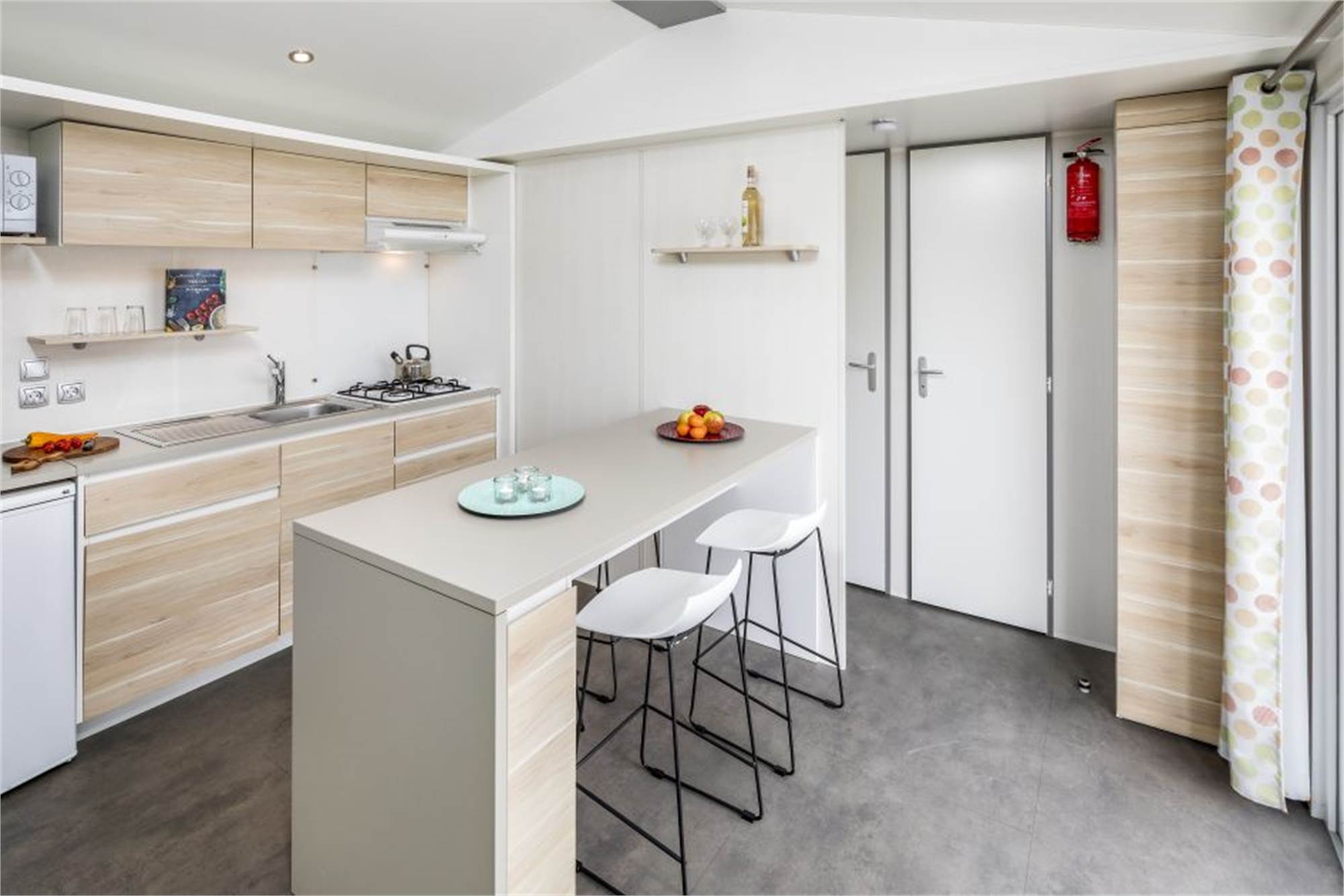 This chalet sleeps four. There is a living room with a TV and a kitchen equipped with various appliances, including a microwave. There are two bedrooms in total, one of which has one double bed, while the other has two single beds. The chalet has a bathroom with a shower and toilet. The terrace is equipped with garden furniture. Wi-Fi is available free of charge.