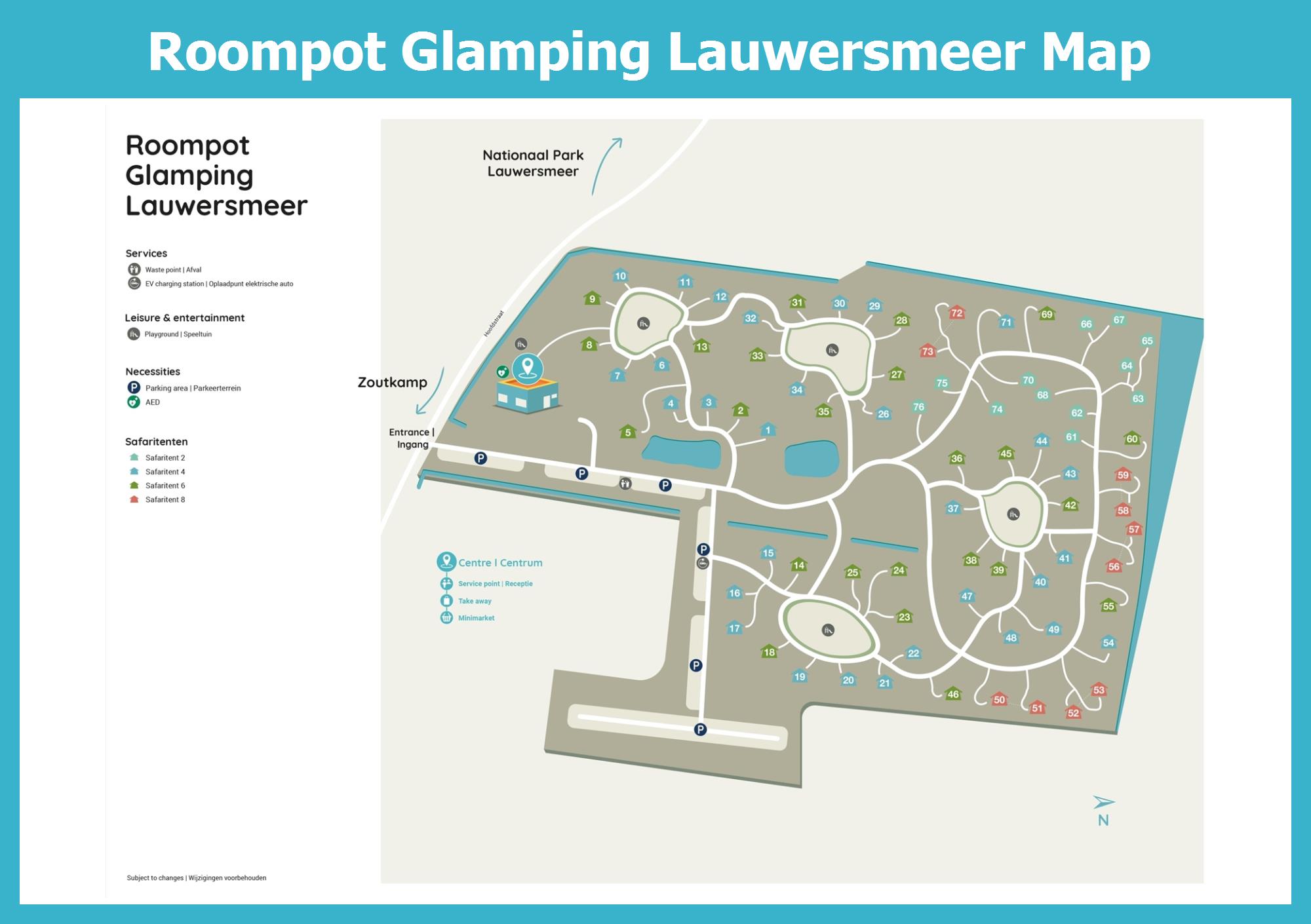 Up-to-date and comprehensive village map of Roompot Glamping Lauwersmeer with all accommodations and facilities, also available as PDF.