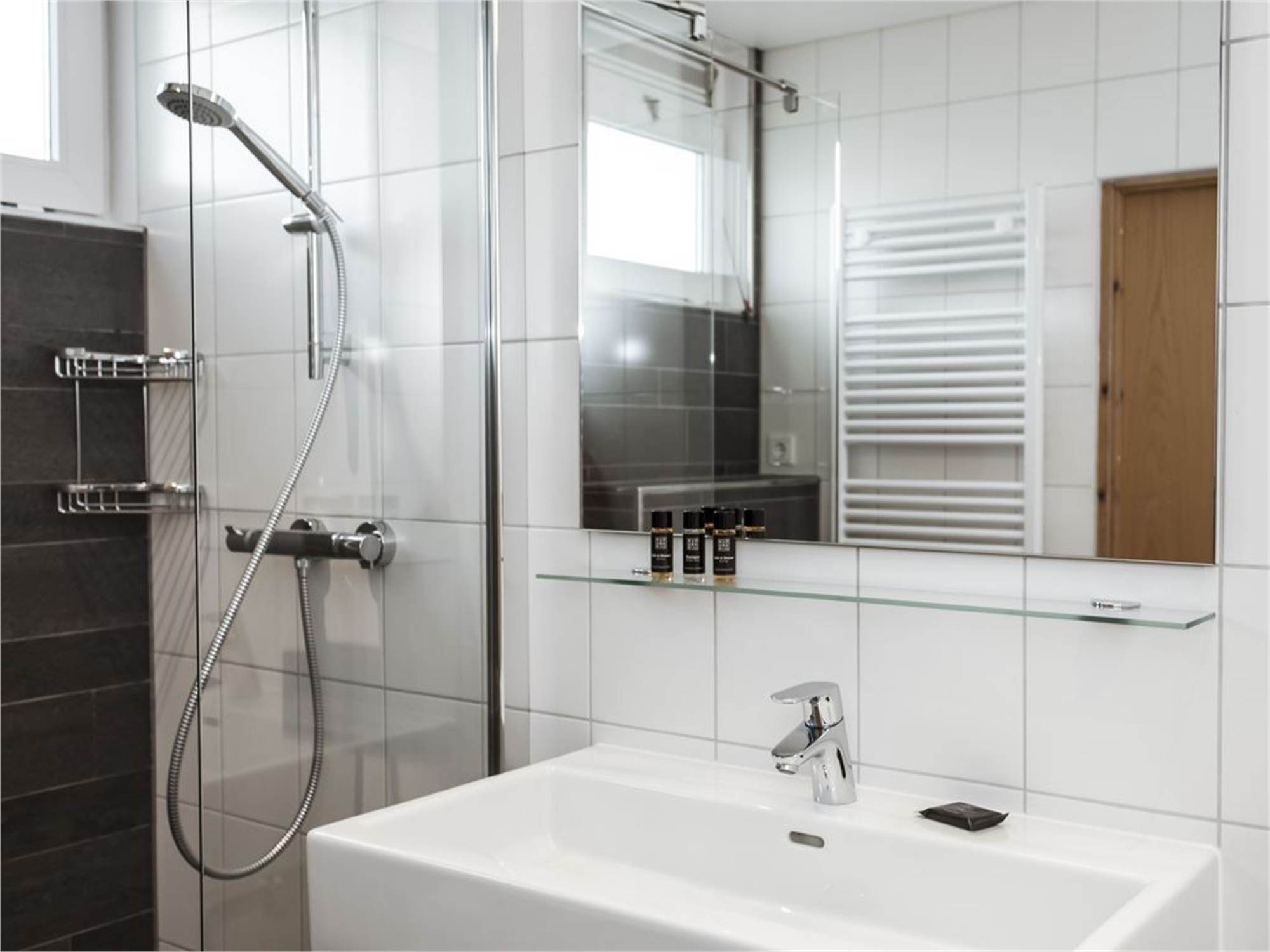 • Bedroom with two single box spring beds, 2 person soft mattress topper, washbasin and flatscreen TV