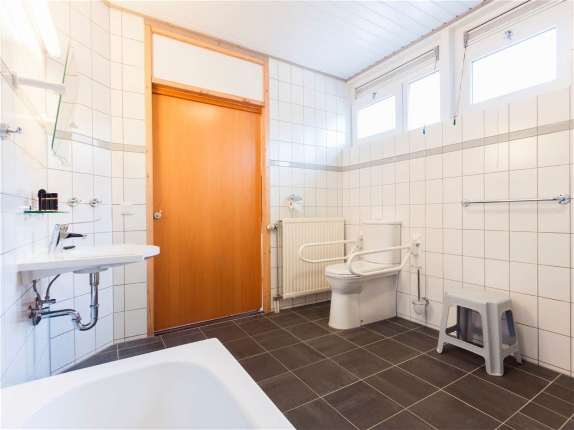Adapted bathroom with bathtub, shower cubicle, shower seat without armrest, grab rails in shower cubicle, adjustable mirror or full-length mirror, washbasin a minimum of 78 cm high and wheelchair-friendly, single lever mixer taps and turning circle a minimum of 150 cm