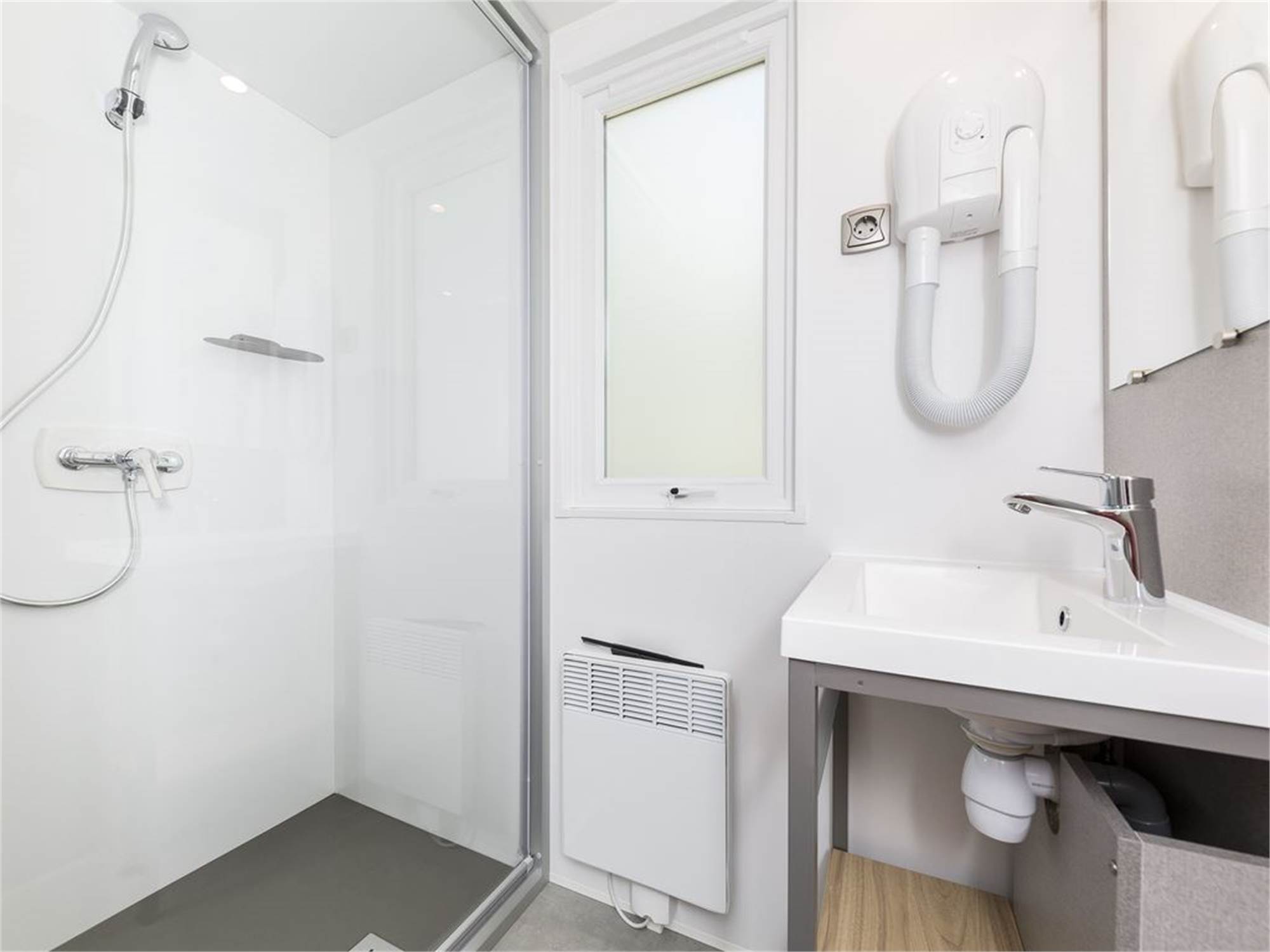 Bathroom en suite with shower cubicle, washbasin and toilet
