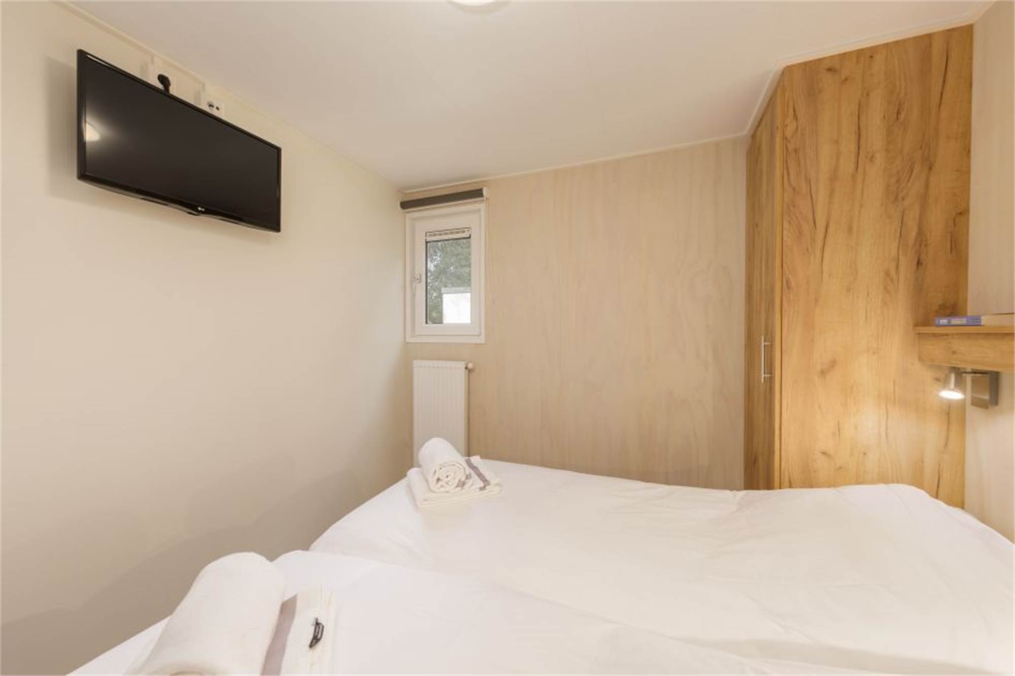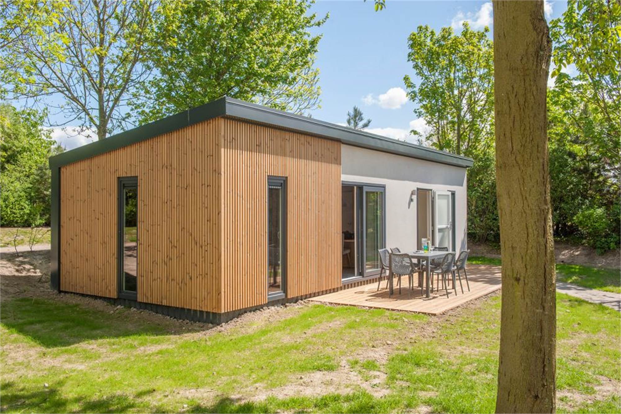 This new chalet is single-storey and sleeps four. The living room features a smart TV and the kitchen is equipped with a combination microwave, dishwasher, coffee pad machine and more. There are two bedrooms, both with two single beds. The bathroom has a walk-in shower. There is a separate toilet. Outside, there is a furnished patio. Last but not least, there is an infra-red sauna at your disposal.