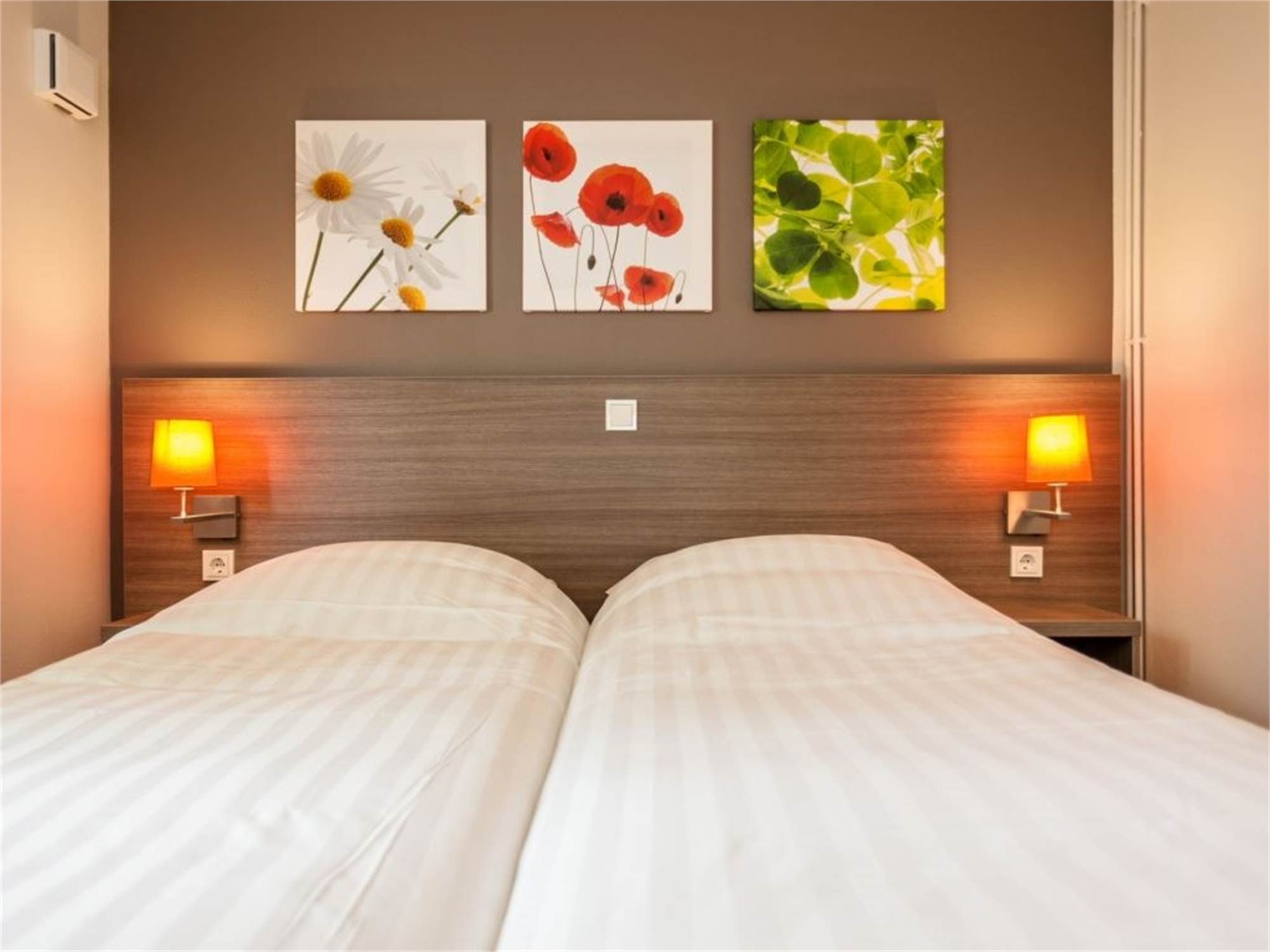 Bedroom with two single box spring beds, washbasin and flatscreen TV