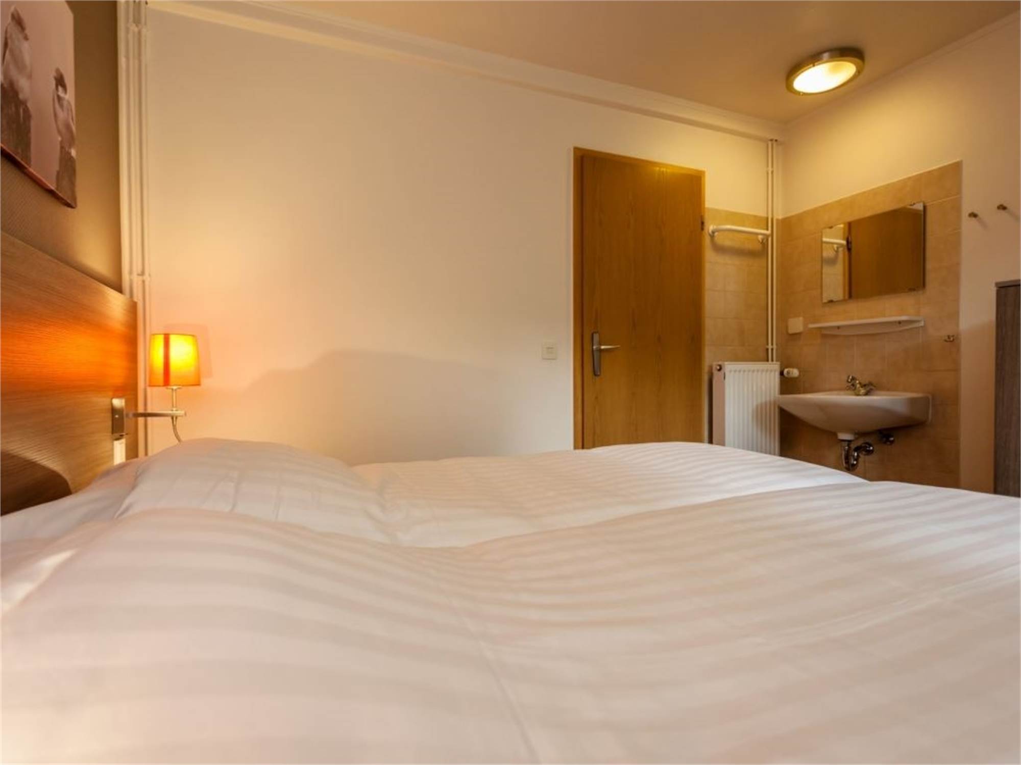 Bedroom with two single Auping box spring beds, soft mattress topper and TV